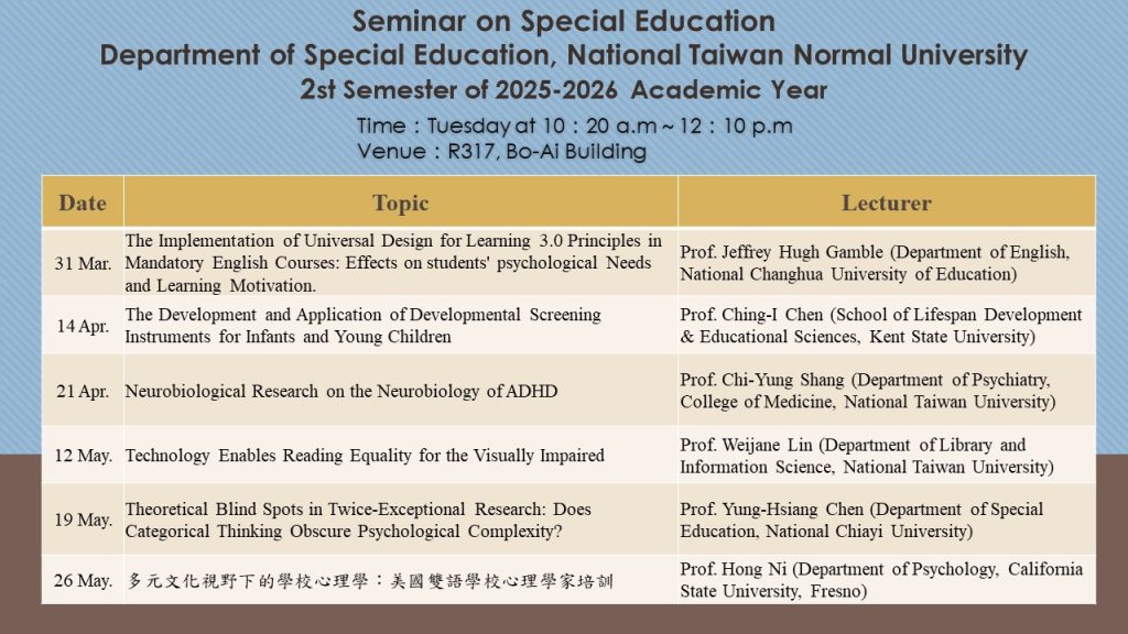 Seminar on Special Education Department of Special Education, National Taiwan Normal University2st Semester of 2025-2026 Academic Year Post author:winniemeng Post published:2026-02-25 Post category:Others